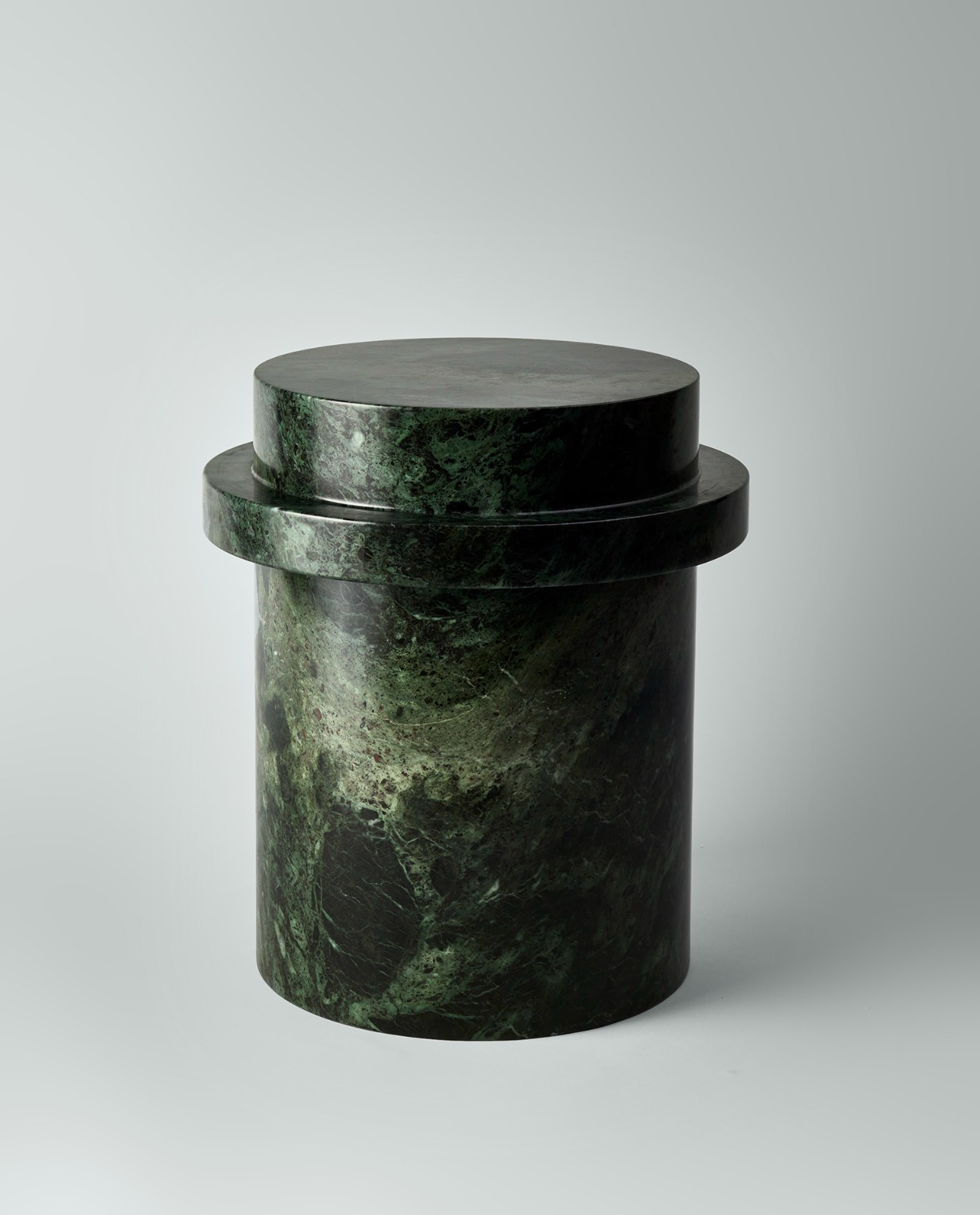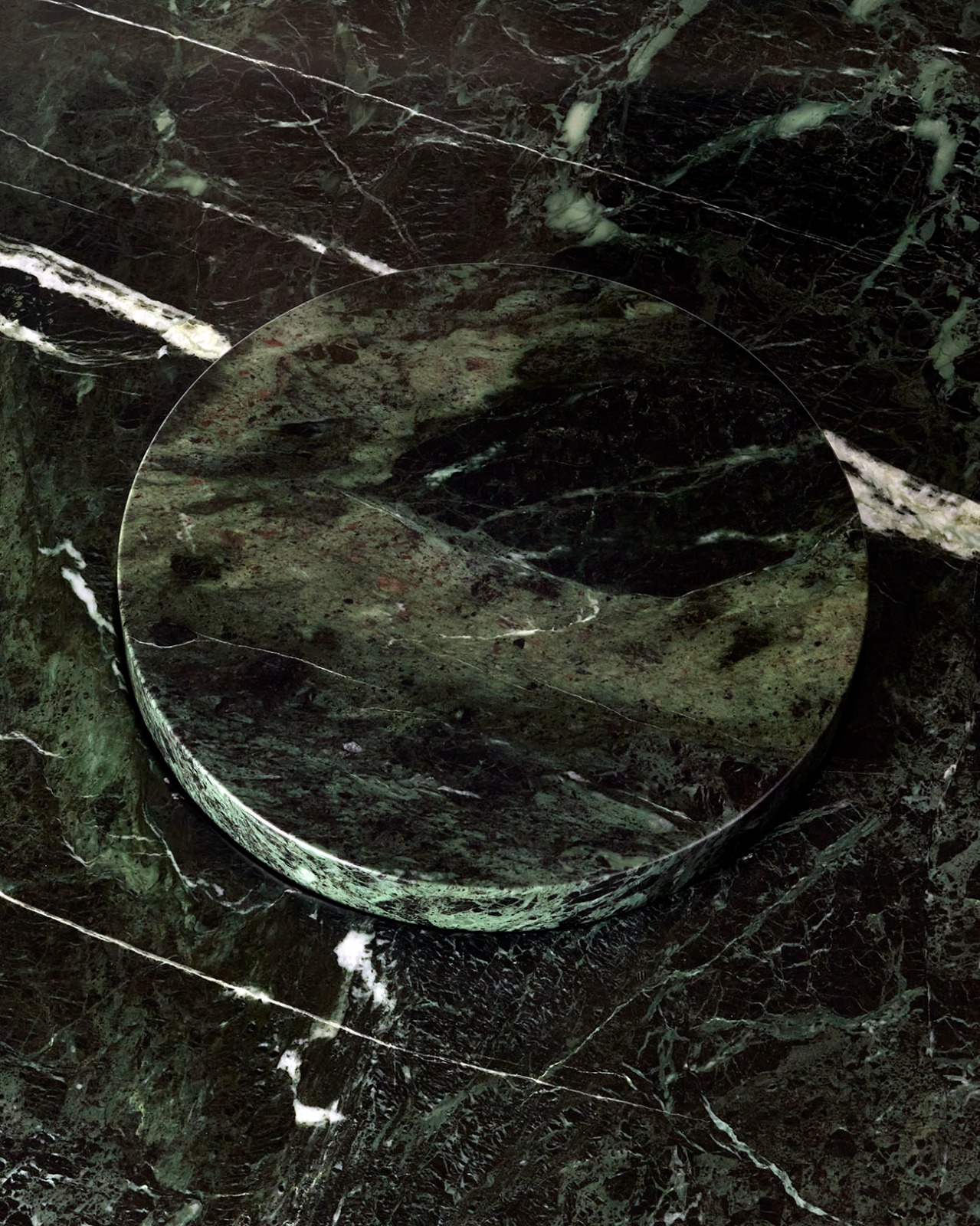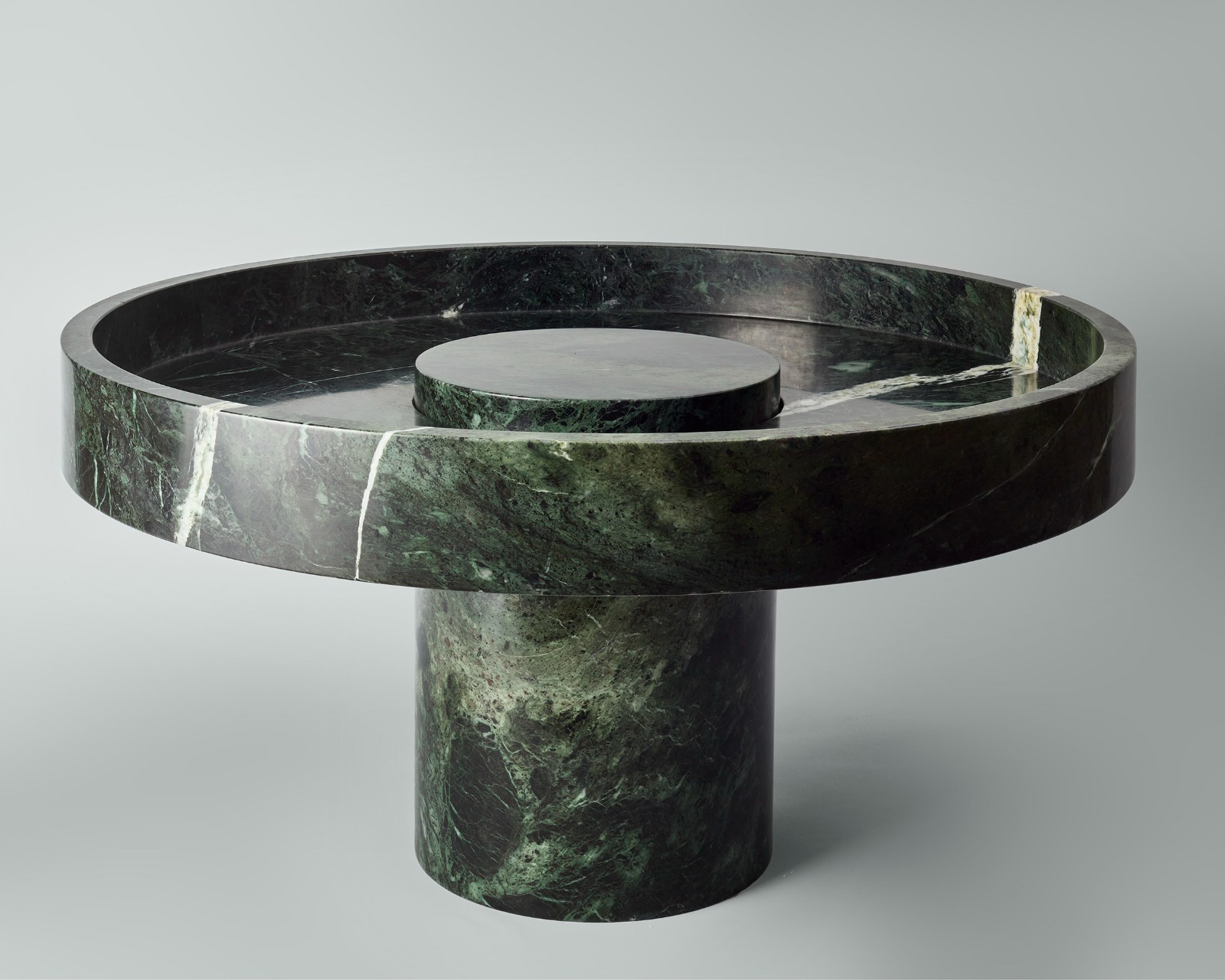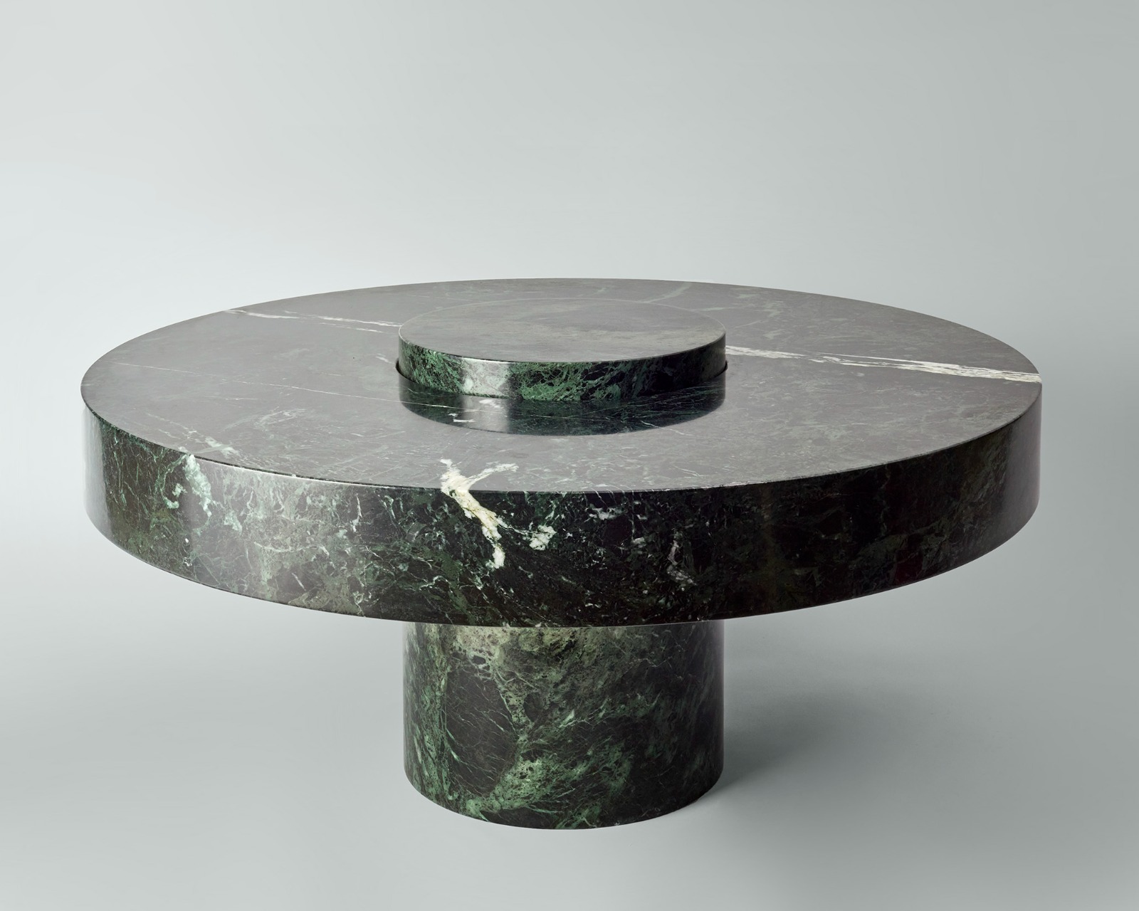 Crafted from Greek Verde Naoussa marble, STACK XL coffee table has a diameter of 104 cm and height of 44 cm. This collaborative project plays with the idea of transforming raw, natural stones into a modulor reversable sculpture.